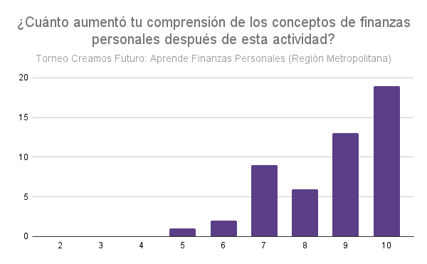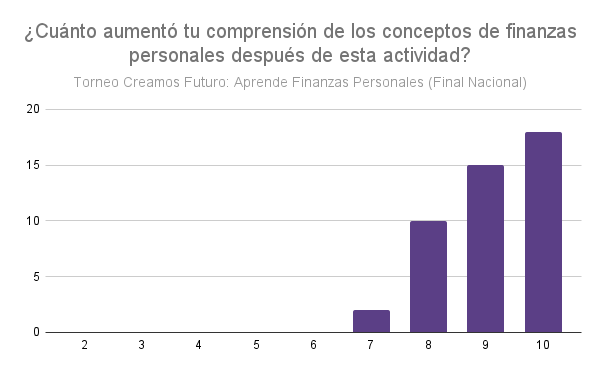 A modo general, en las cuatro versiones del Torneo Creamos Futuro, tanto en sus instancias regionales como nacional, el 80% de los estudiantes considera que gracias a estas actividades su comprensión de conceptos financieros aumentó de forma significativa.
